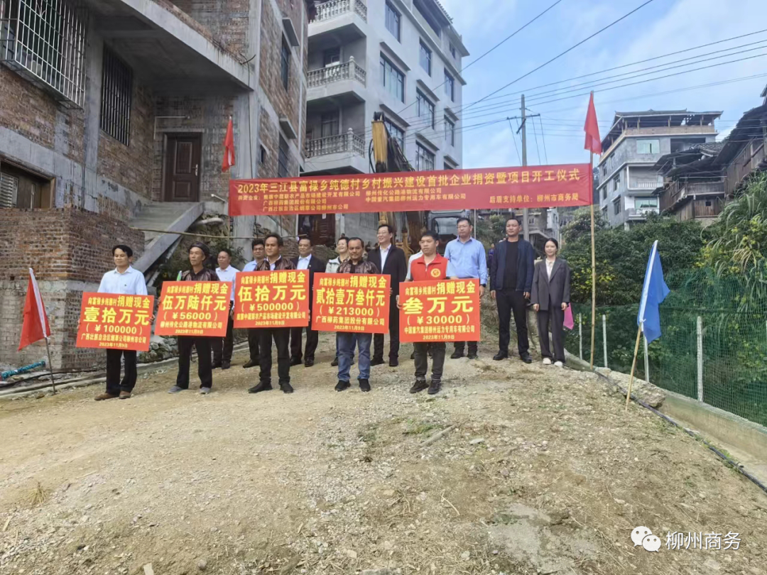2023年11月9日上午,一场简单而特别的乡村振兴企业捐资暨项目开工仪式在三江侗族自治县富禄乡纯德村举行。三江侗族自治县委书记贺莹、柳州市商务局局长杨志刚、柳州市烟草专卖局(公司)局长刘峰、柳州市商务局副局长韩伟、三江侗族自治县委组织部部长毛国勇等有关领导及捐资企业有关领导共同出席仪式活动。