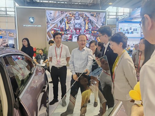 中国贸促会会长任鸿斌视察东风柳汽展位新能源汽车,自治区商务厅副厅长李硕陪同