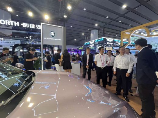 中国贸促会会长任鸿斌视察东风柳汽展位新能源汽车,自治区商务厅副厅长李硕陪同
